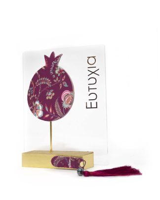 Χειροποίητο γούρι 2026 με υφασμάτινο ρόδι σε ξύλινη βάση και πλάτη απο plexiglass  με ευχή ΄΄ευτυχια΄΄