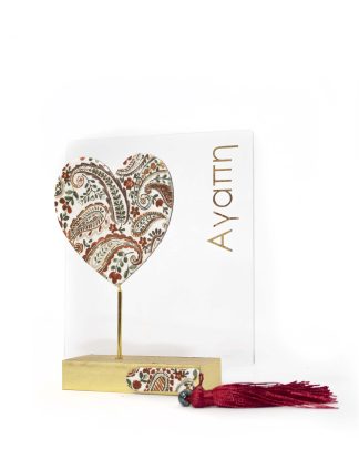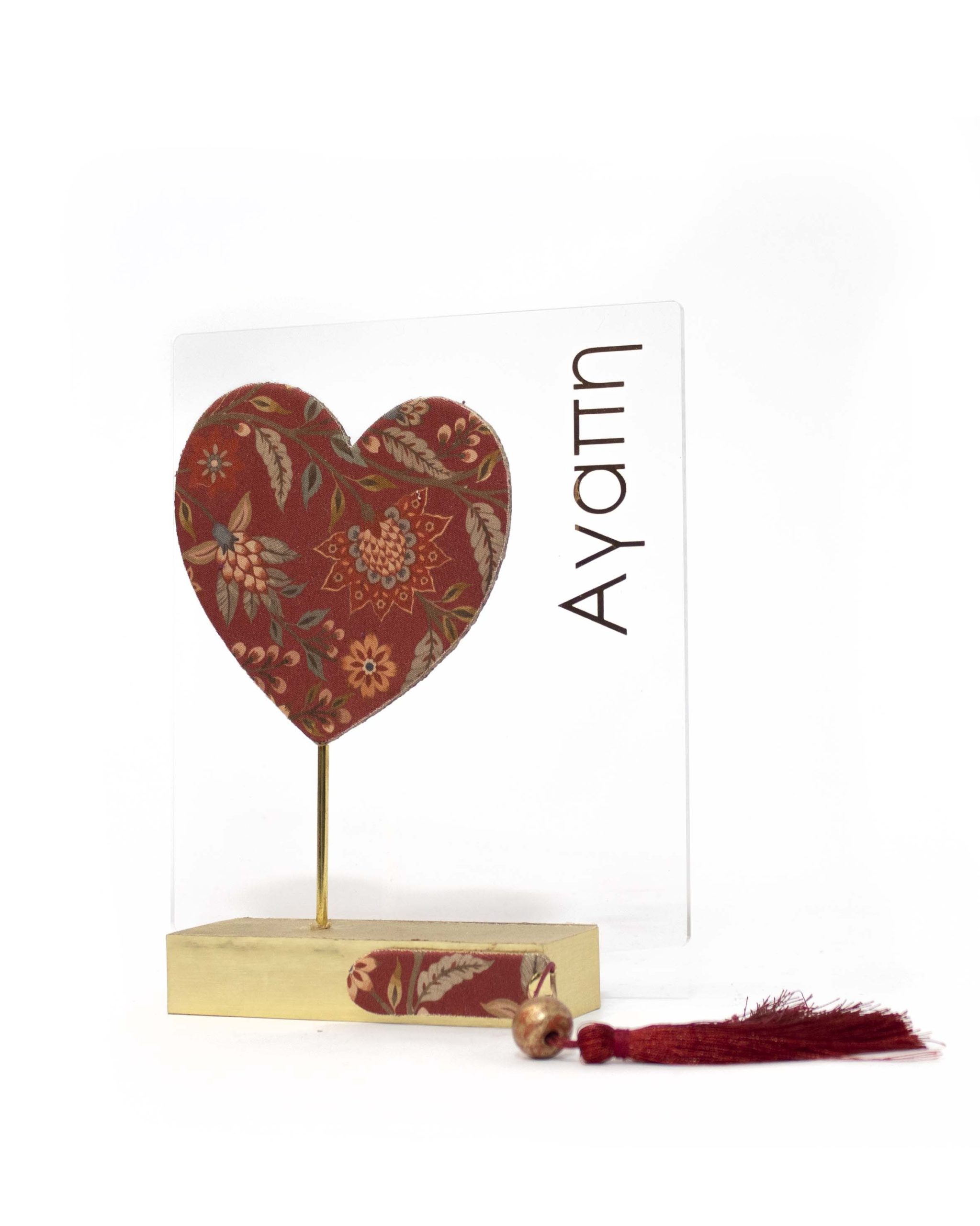 Χειροποίητο γούρι 2026 με υφασμάτινη καρδιά σε ξύλινη βάση και πλάτη απο plexiglass  με ευχή ΄΄αγάπη΄΄