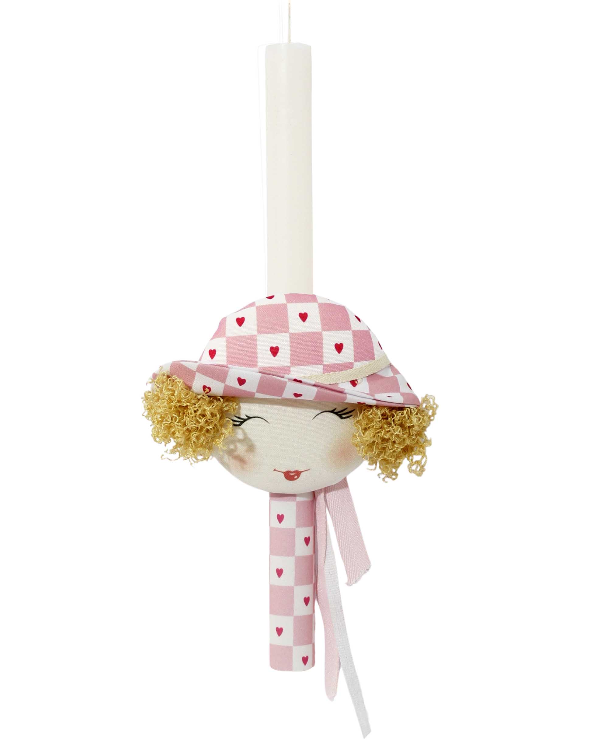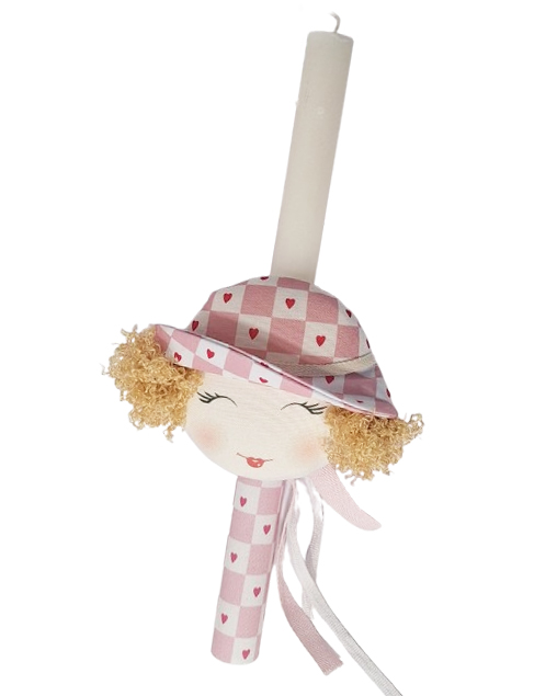 Πασχαλινή λαμπάδα με χειροποίητo υφασμάτινο κοριτσάκι με καπέλο