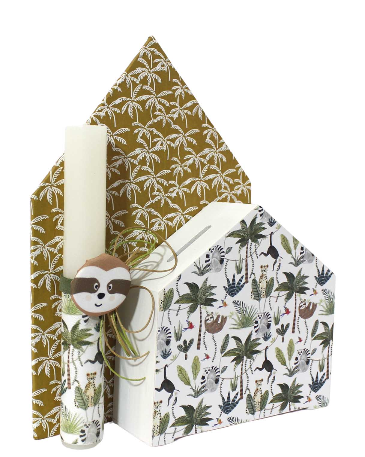 πασχαλινό σετ, λαμπάδα και επιτραπέζιο διακοσμητικο σπιτάκι με ξύλινο κουμπαρα.