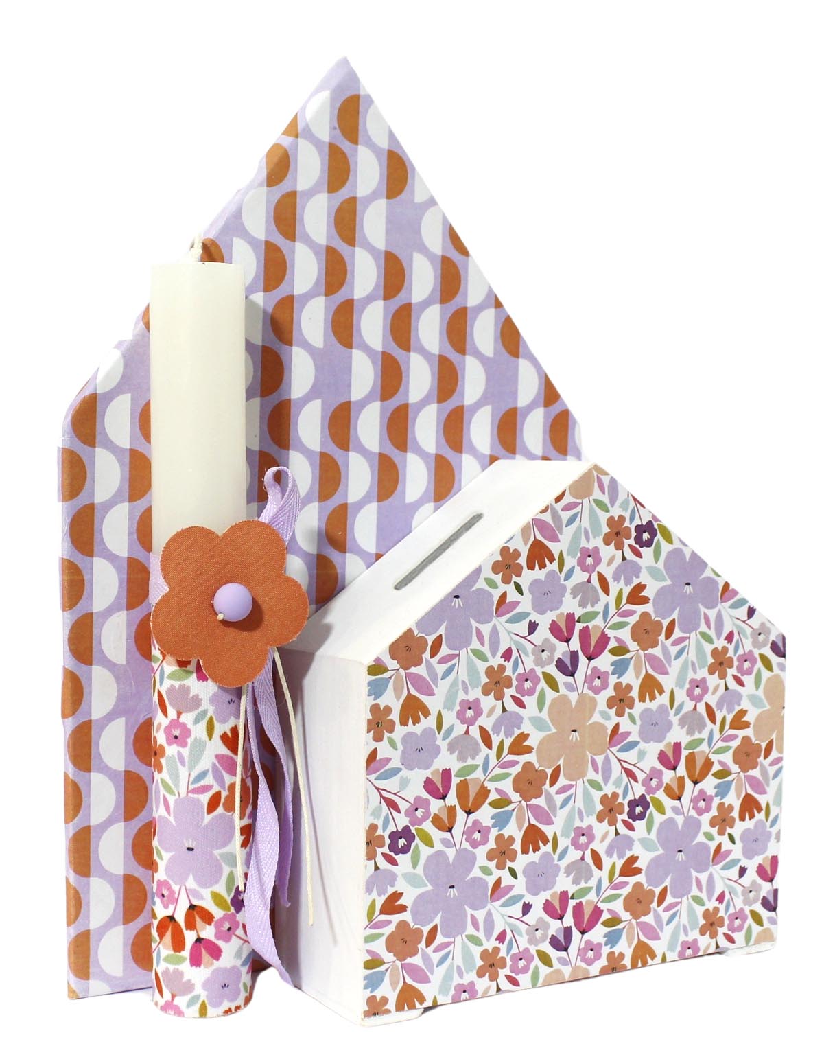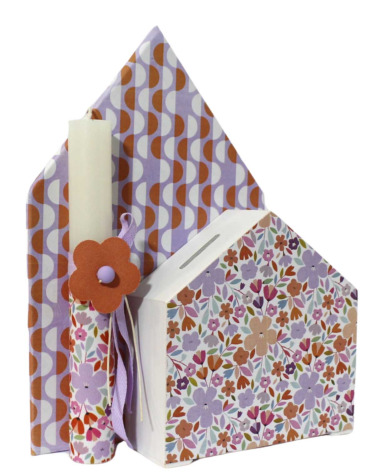 πασχαλινό σετ, λαμπάδα και επιτραπέζιο διακοσμητικο σπιτάκι με ξύλινο κουμπαρα.