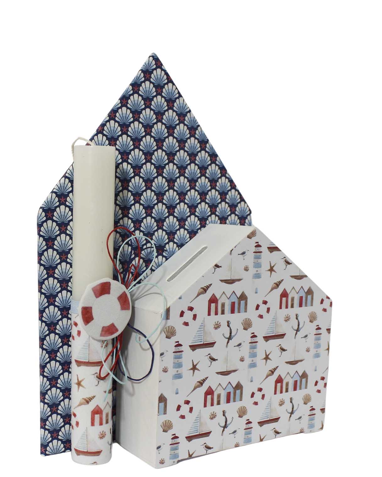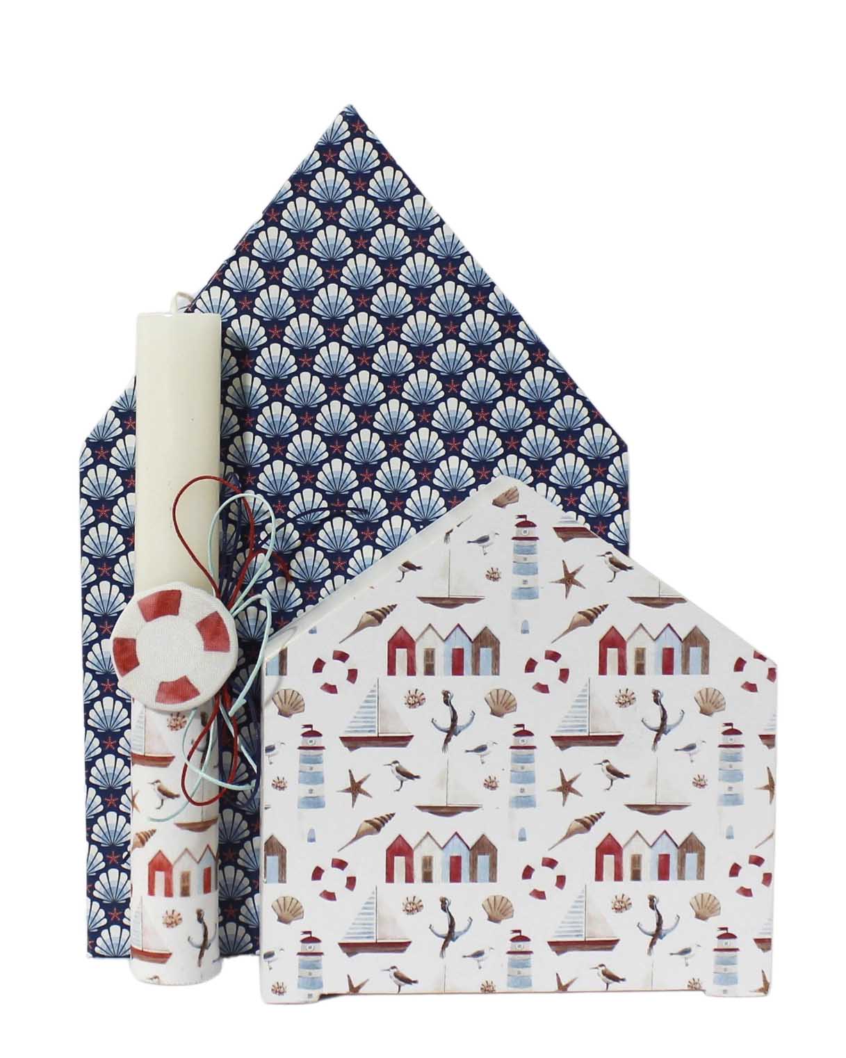 πασχαλινό σετ, λαμπάδα και επιτραπέζιο διακοσμητικο σπιτάκι με ξύλινο κουμπαρα.