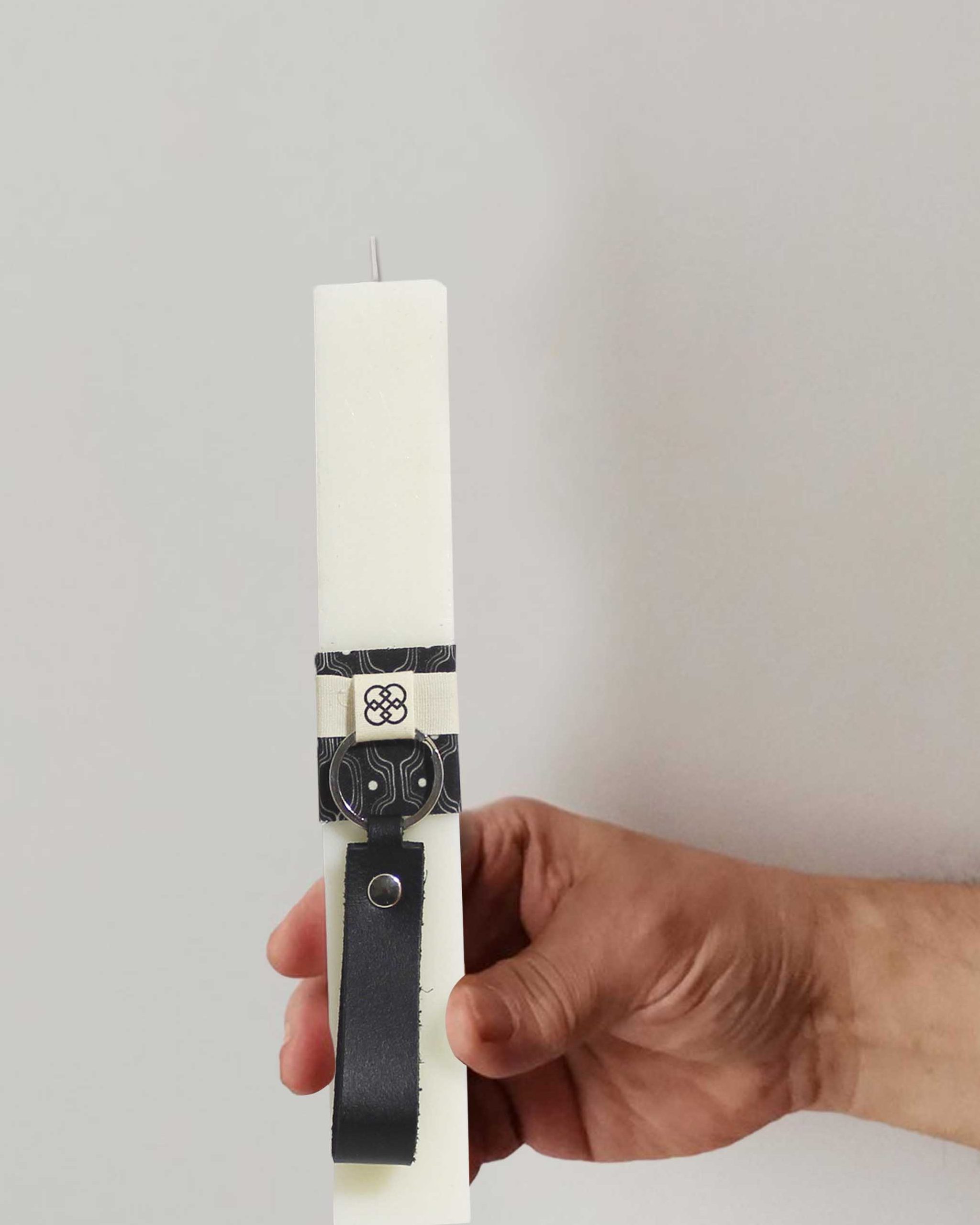 Χειροποίητη πασχαλινή λαμπάδα πλακέ με δερμάτινο μπρελόκ σε υφασμάτινο πουγκί.