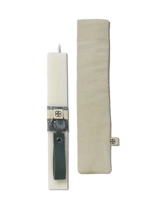 Χειροποίητη πασχαλινή λαμπάδα πλακέ με δερμάτινο μπρελόκ σε υφασμάτινο πουγκί.
