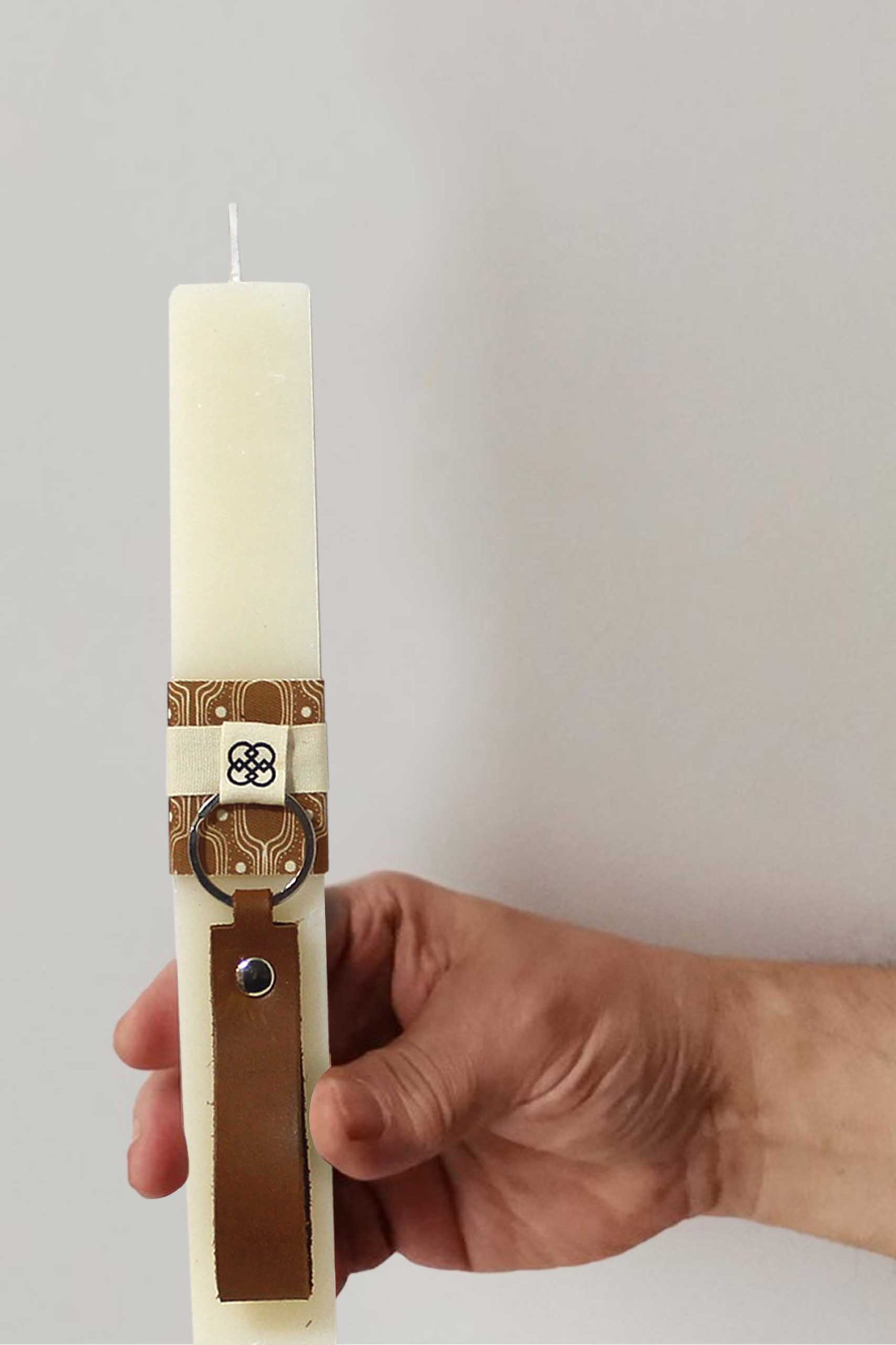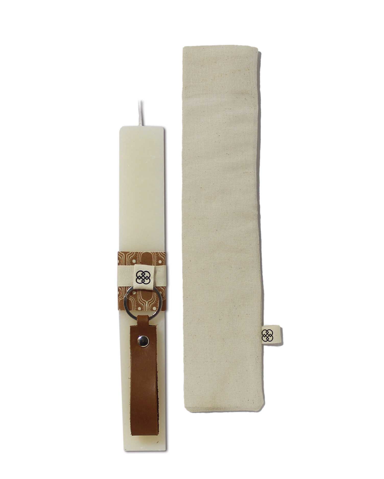 Χειροποίητη πασχαλινή λαμπάδα πλακέ με δερμάτινο μπρελόκ σε υφασμάτινο πουγκί.