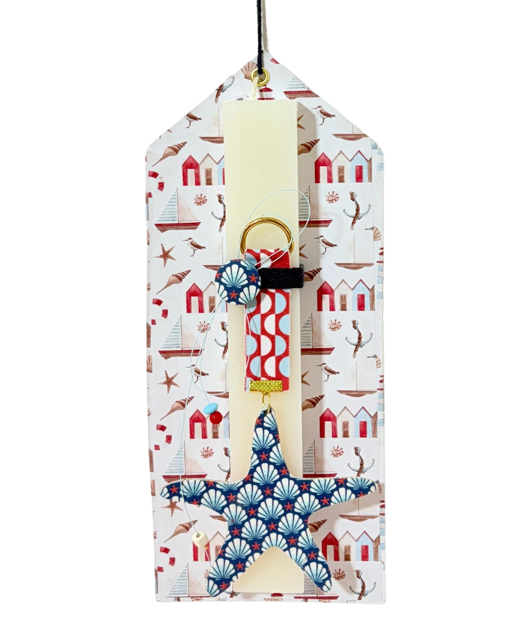 Πασχαλινή πλακέ λαμπάδα ελαφρώς αρωματική, με κρεμαστό υφασμάτινο  διακοσμητικό ενισχυμένο απο χοντρό χαρτόνι  σε ασορτί χειροποίητο σπιτάκι καρτολίνα.