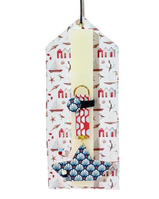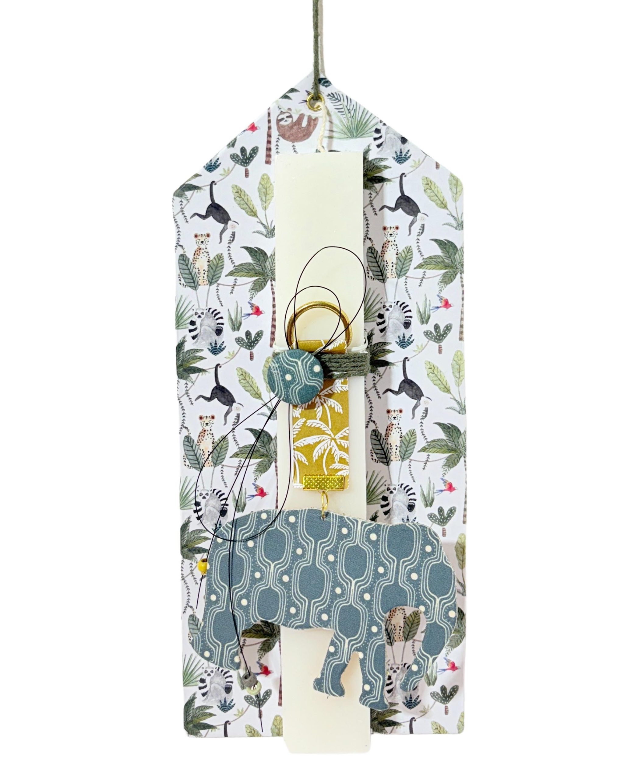Πασχαλινή πλακέ λαμπάδα ελαφρώς αρωματική, με κρεμαστό υφασμάτινο  διακοσμητικό ενισχυμένο απο χοντρό χαρτόνι  σε ασορτί χειροποίητο σπιτάκι καρτολίνα.