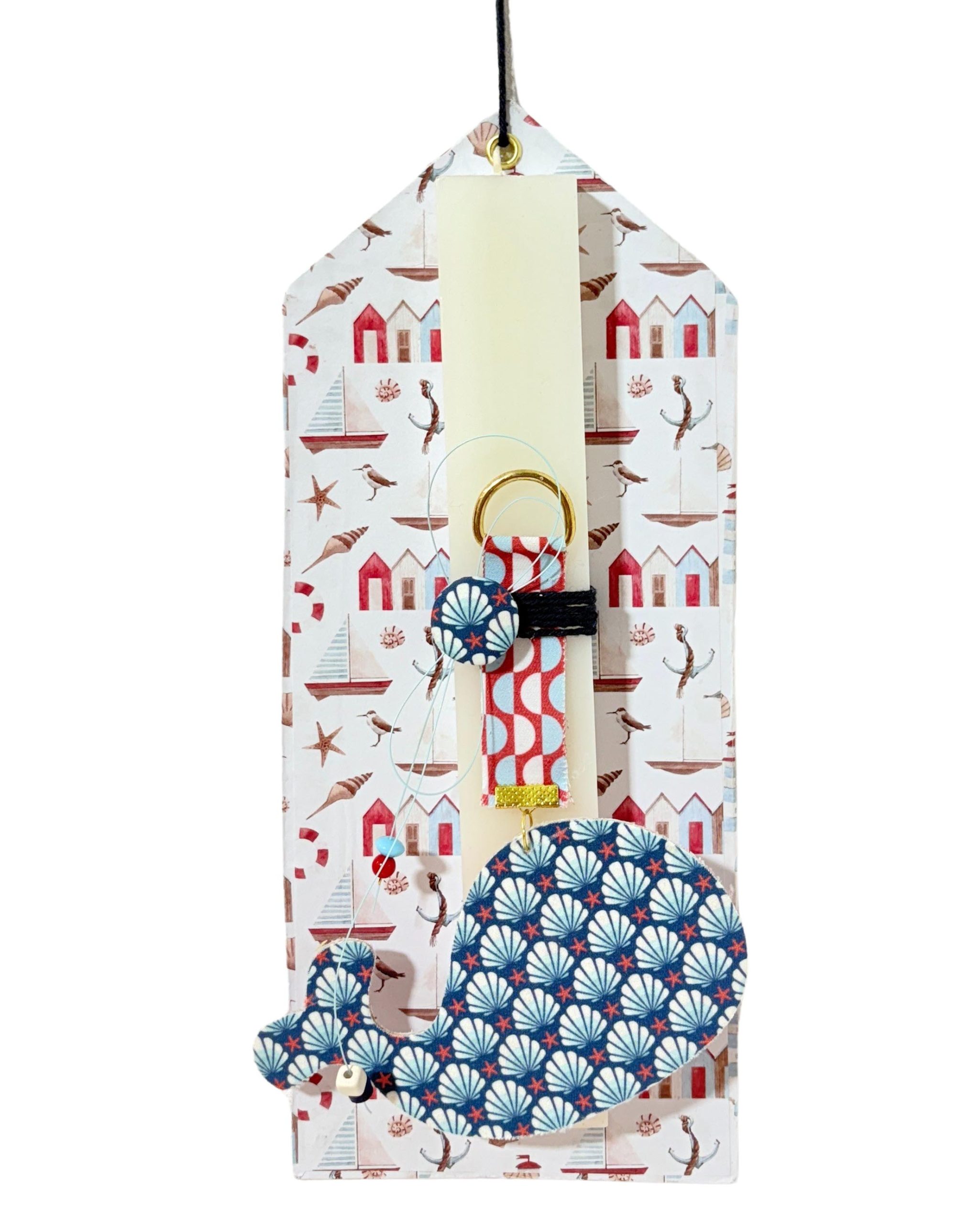 Πασχαλινή πλακέ λαμπάδα ελαφρώς αρωματική, με κρεμαστό υφασμάτινο  διακοσμητικό ενισχυμένο απο χοντρό χαρτόνι  σε ασορτί χειροποίητο σπιτάκι καρτολίνα.