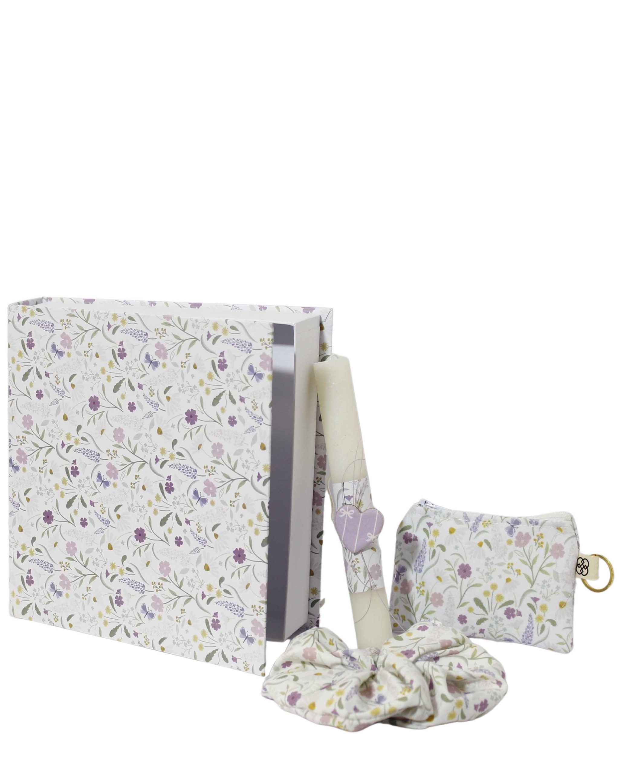 Πασχαλινή λαμπάδα, πορτοφολάκι και scrunchie αξεσουαρ μαλλιών σε ασορτί χειροποίητο κουτί  βιβλίο.