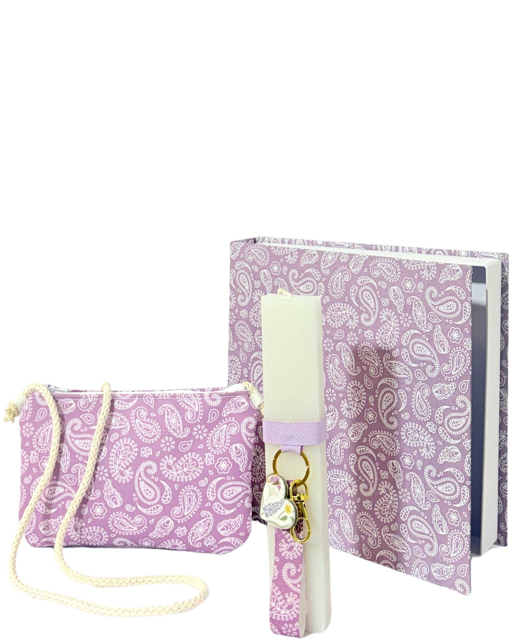 Πασχαλινή λαμπάδα με μπρελοκ και τσαντάκι χιαστί απο ενισχυμένο ύφασμα σε ασορτί χειροποίητο κουτί βιβλίο.